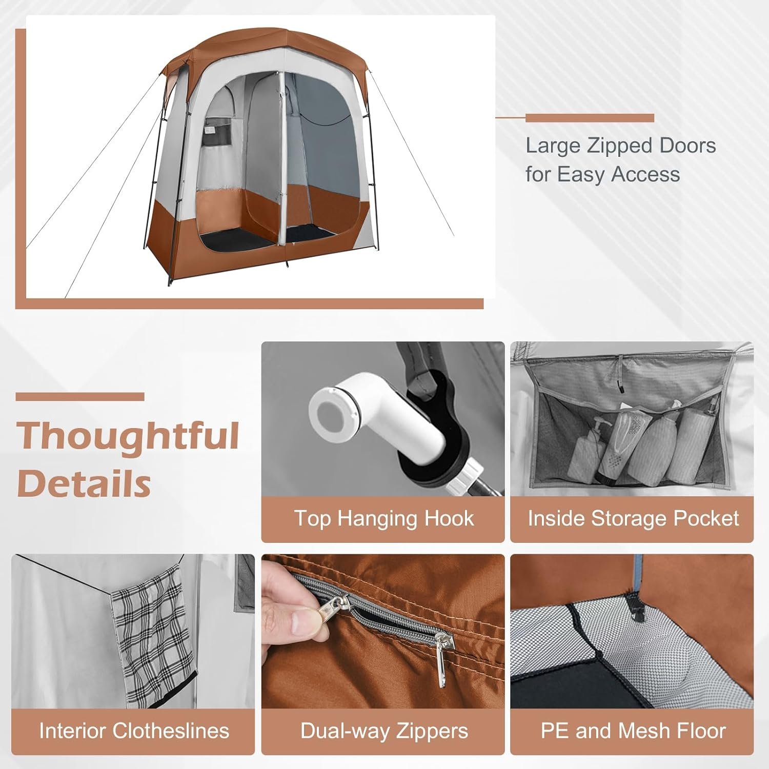 - 【2-way Zippered Door & Good Ventilation】The shower tent has a large 2-way zippered door for easy access and good ventilation when you open it. In addition, there are black windows in the front and back of the tent, which you can close for privacy or open for better ventilation according to different conditions.